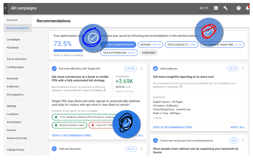 - Use your optimization score in the recommendations page to improve your campaigns. This will help account for future periods even more. Don’t let campaigns be set-back by your budget!